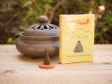 Patchouli has been used for hundreds of years to create an atmosphere perfect for relaxation. Often times used during meditation or spiritual enlightenment, it is believed to boost moods by relieving stress, anxiety, and depression. Auroshikha incense cones are made of a paste consisting of the powders of dried flower petals, sweet scented herbs and woods, spices, resins, natural essential oils, and charcoal to assist with burning. The paste is then molded into a cone and left to dry.