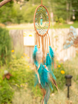 Our Meaning dreamcatcher is meant to capture good energy and pass it along to the dreamer. The dreamcatcher is wrapped in a soft faux leather and features a mixture of teal, white, and brown feathers. At the heart of the hoop are 14 point teal beads and crystal. This dreamcatcher is great in any bedroom or as a decorative handmade piece in any living space.