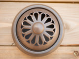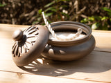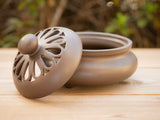 The Om Mani round incense bowl in brown features a geometric floral lid on a wide round base. The bowl is intended to burn cone incense and rope incense. The black fabric at the bottom is a heat resistant fabric allowing incense to be burned directly on the fabric. You can also add sand to the base in place of the fabric which will allow you to hold incense sticks in the burner as well. Find your place of calm with this elegant incense bowl.