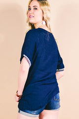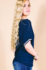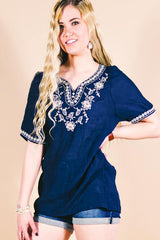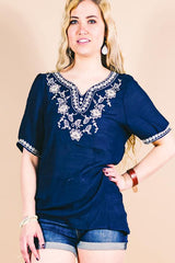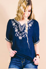 Women's Navy Short Sleeved Top - V-Neckline - Floral - Cottagecore