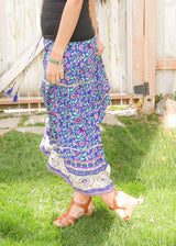 Our Elderberry skirt features an adorable blue and purple coloring with floral patterns. The skirt is lightweight and hangs just above the ankle, perfect for walks in the park or at the beach. Our skirt is perfect for getting that hippie and boho look and can be worn for both casual and formal occasions!