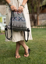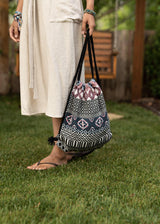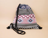 Bali Black Drawstring Multifunctional Hobo Bag & Mini Canvas Backpack With Geometric Patterns