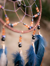 Dreamcatchers have a long and important history in Native American culture. Used as protective charms, they were made from a net or web woven onto a willow hoop. Often found above infant cradles, dreamcatchers were believed to ward off harm. Originating from the legend of the Spider Woman, who cared for the children and people of the land, dreamcatchers are used to catch any harm that may be near. Our Bright Blue Feathered Dreamcatcher is decorated with feathers, beads and a wooden charm, making it an attractive addition to any home.