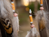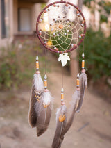 Dreamcatchers have a long and important history in Native American culture. Used as protective charms, they were made from a net or web woven onto a willow hoop. Often found above infant cradles, dreamcatchers were believed to ward off harm. Originating from the legend of the Spider Woman, who cared for the children and people of the land, dreamcatchers are used to catch any harm that may be near. Our Leaf & Wooden Beads Dreamcatcher is decorated with feathers, beads and a wooden charm, making it an attractive addition to any home.