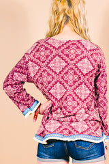 Women's Long Sleeved Red Sweater - Nordic Sweater - Hippie Top - Round Neckline with Dropped Shoulder