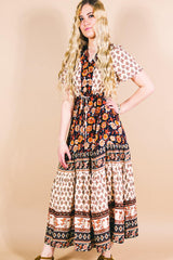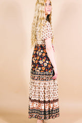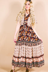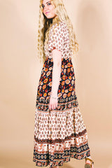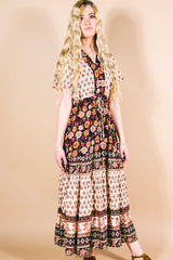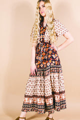 Brown & Orange Floral Long Midi Dress - Autumn Fall V-Neckline Dress - Hippie Clothing - Cottagecore